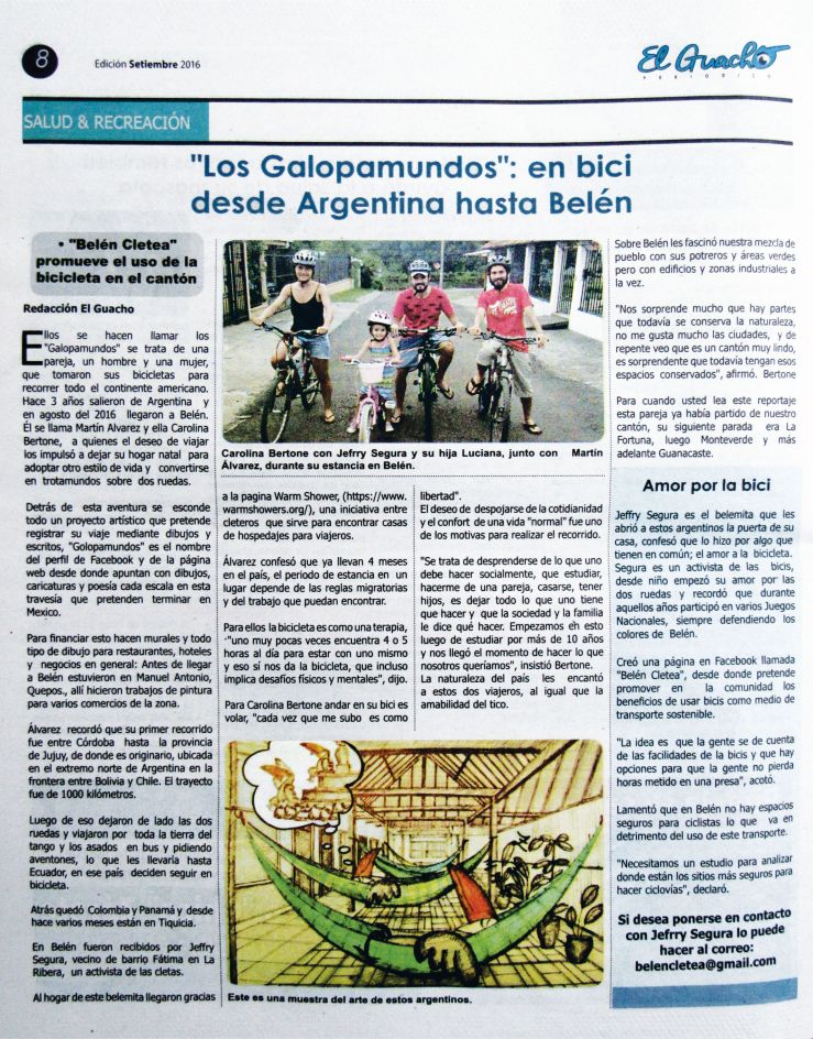 Septiembre de 2016. Diario El Guacho, Belén – Costa Rica.